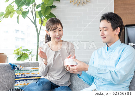 部屋でプレゼントを渡す若い男女のカップル