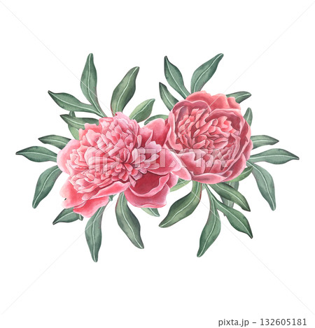 Open pink peony flowers with leaves. Hand-painted watercolor botanical illustration isolated on white for floral design, wedding invitations, packaging, branding, cards, botanical projects, posters