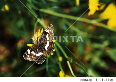 A butterfly (Araschnia levana) with outstretched wings is sitting on a yellow flower