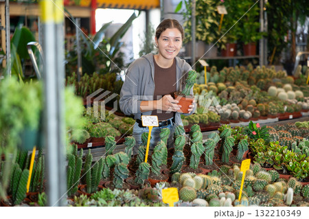 Girl works as auxiliary worker in plant store warehouse, review cactus seedling