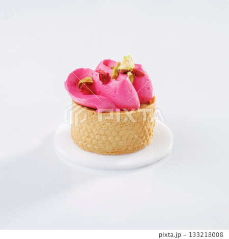 Delicious cake basket is filled with white air cream and decorated with red cherry