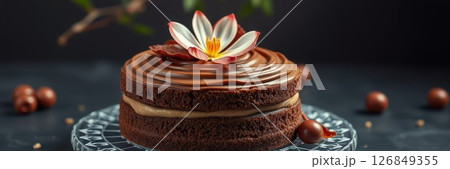 Decadent chocolate cake with elegant flower decoration on a glass stand in dimly lit setting