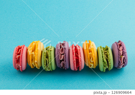 Colorful macaron display on a blue background