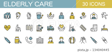 高齢者のお世話や介護 ラインアイコンセット カラー