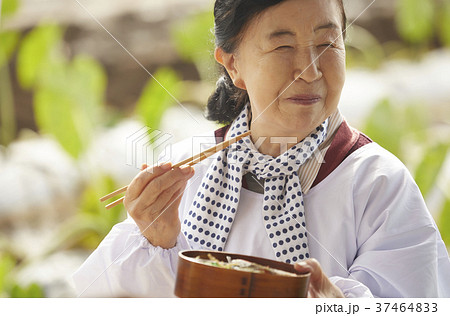 農業 お弁当を食べるシニア女性