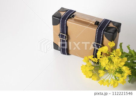 菜の花の生花と旅行カバンで春の旅行イメージ