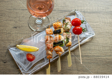 炭火でじっくり焼き上げた焼き鳥(タレ)と赤ワインのグラス