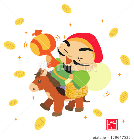 馬のぬいぐるみにのって小槌を振り、小判が飛び出す大黒様のイラスト