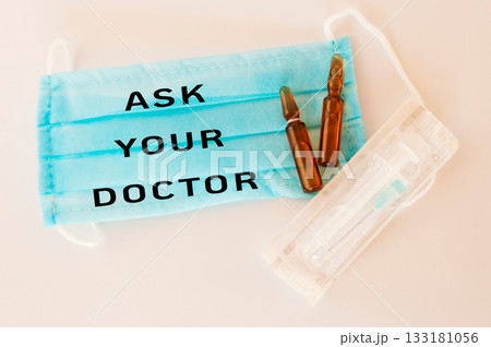 Medical mask with text, vials, and syringe on a clean surface for healthcare awareness
