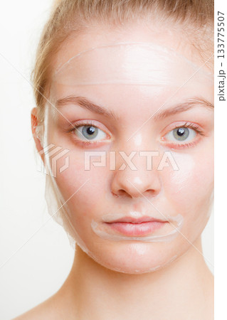 Young caucasian female undergoing facial treatment with carbon mask in spa