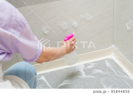 【風呂掃除をするミドル主婦 水栓、スプレー、泡有り】