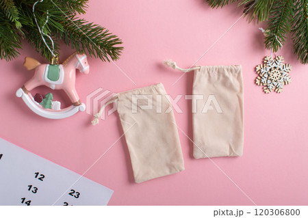 Christmas Advent calendar with gift velvet bags on a light pink background. Flat lay