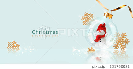 Elegant winter background with snowman ornament, ribbon and copy space. Ideal for greeting card, poster, flyer, social media, banner and holiday sale.