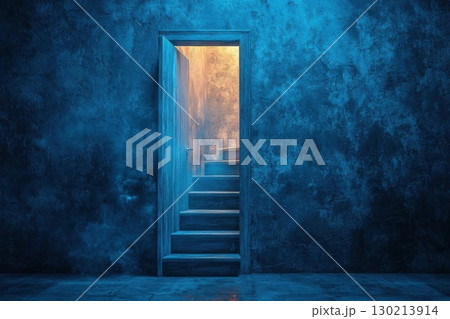 Illuminated staircase leading to an open door, symbolizing progress and achievement in a warm, inviting atmosphere of hope and opportunity