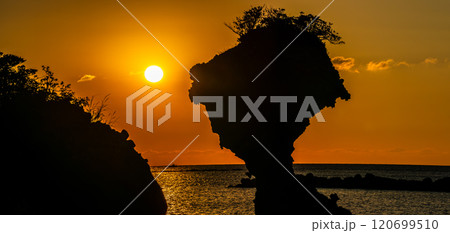 りんご岩(傘岩)の夕陽 柿泊海岸 ながさきサンセットロード パノラマ 【長崎市】