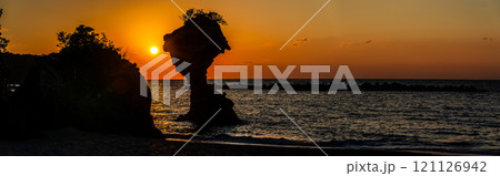りんご岩(傘岩)の夕陽 柿泊海岸 ながさきサンセットロード パノラマ 【長崎市】