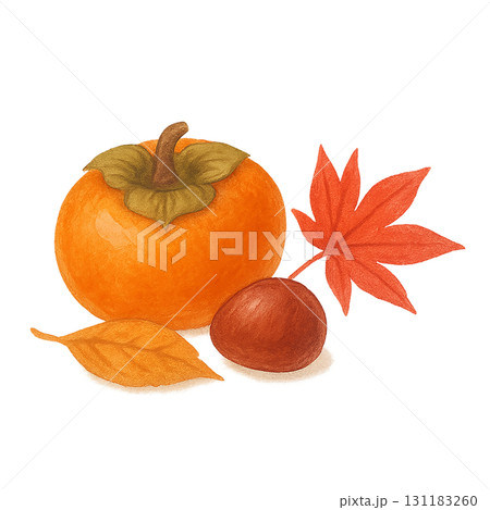 柿と栗と紅葉の水彩イラスト素材 秋の味覚と季節の果物 PNG