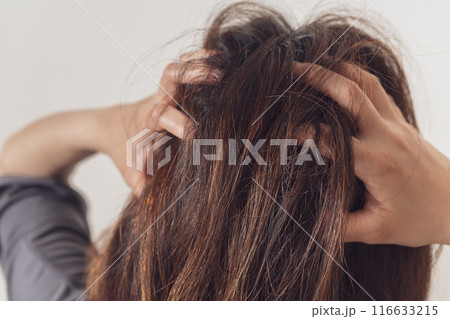 頭を搔きむしる女性の頭部のクローズアップ