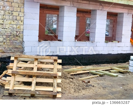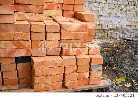Construction. Stacked bricks on a wooden pallet, ready for installation.