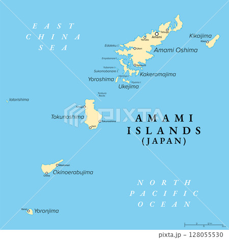 Amami Islands, island group of Japan, political map. Japanese archipelago in the Satsunan Islands, which is part of the Ryukyu Islands, and belonging to the Kagoshima Prefecture. Illustration. Vector