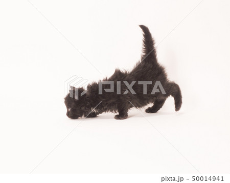 尻尾を上げて歩く黒いメインクーンの仔猫