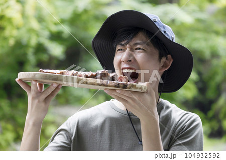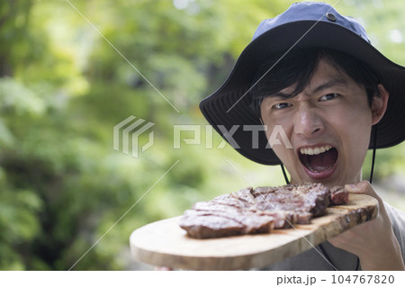 大きな肉にかぶりつこうとする若い男性 バーベキューイメージ