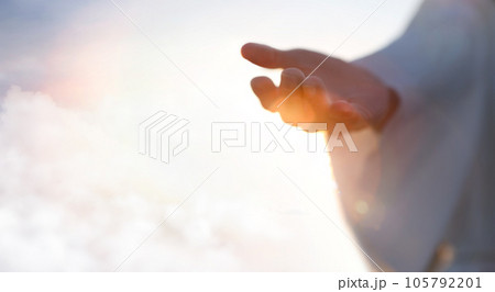 Jesus Christ with open arms reaching out in the sky, hand gestures of Jesus dying on the cross and resurrected, heaven and salvation, faith and love, easter concept