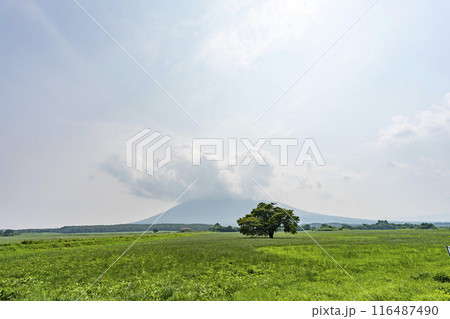夏の上坊牧野の一本桜と青空 岩手県八幡平市