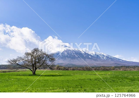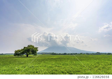 夏の青空と上坊牧野の一本桜 岩手県八幡平市