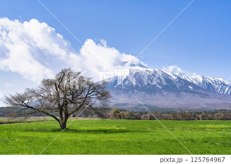 早春の上坊牧野の一本桜と岩手山 蕾 岩手県八幡平市