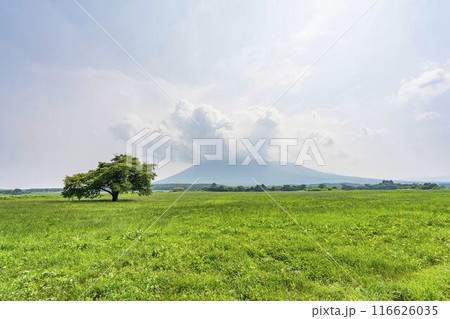 夏の青空と上坊牧野の一本桜 岩手県八幡平市