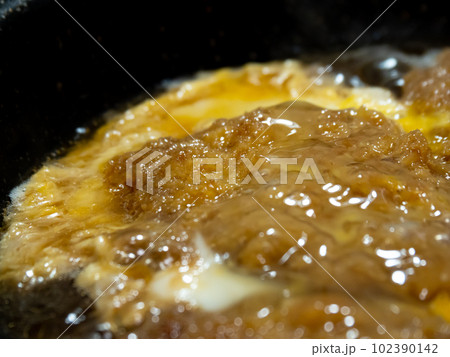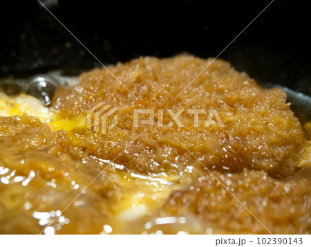 かつとじ調理シーン。豚カツ(豚ひれかつ)を卵とじする。