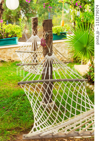 Two comfortable hammocks is gracefully hanging from a tree in a lovely garden