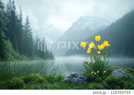 Beautiful Wildflowers Near Tranquil Lake with Misty Mountains in Background