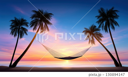 Tropical sunset beach with hammock and palm trees, a serene vacation paradise