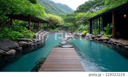 serene outdoor hot spring surrounded by lush mountain forest, featuring wooden pathways and natural stone elements. tranquil water invites relaxation and rejuvenation in peaceful setting