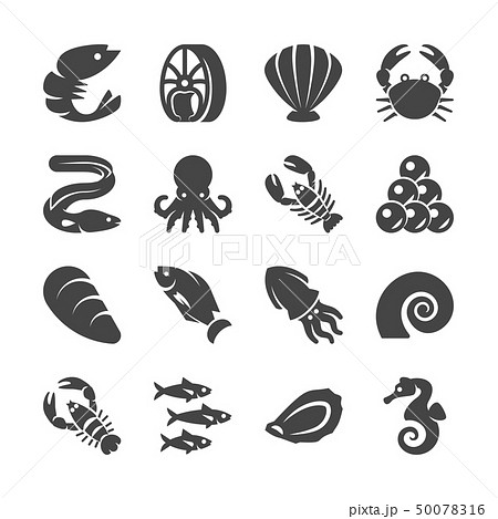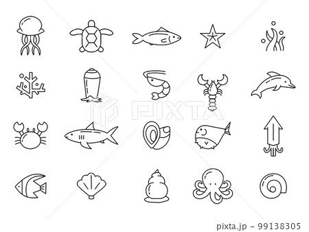 Sea fish. Ocean animal icons. Seafood outline symbols. Octopus and shell. Jellyfish in coral. Marine food. Starfish and seaweed. Underwater nature. Oyster and crab. Vector line recent pictograms set