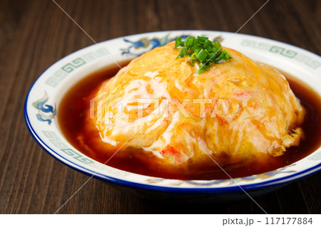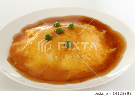 餡かけ中華風オムライス、天津飯を白背景で撮影