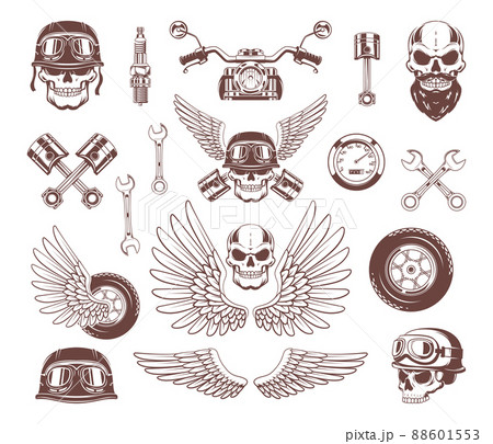 Biker badges. Motorcycle emblems with bikes skull and choppers protective helmet and wings exact vector pictures collection