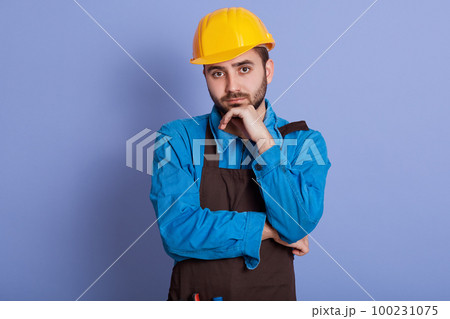 Horizontal shot of attentive serious young handyman having pensive facial expression, standing isolated over blue background, wearing apron, helmet and overalls, having thoughts about project.