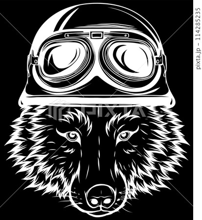 white silhouette of head wolf with helmet on black background