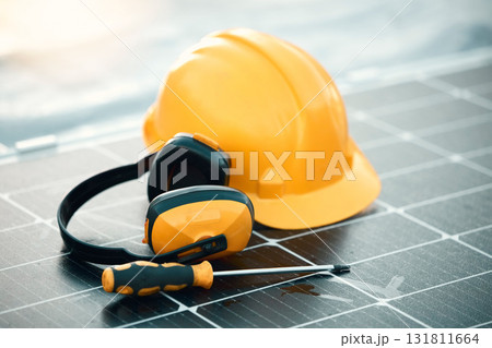 Solar panel maintenance, tools and outdoor by helmet, headphones or renewable energy by blurred background. Photovoltaic tech goals, sustainability vision and eco friendly electricity by screwdriver