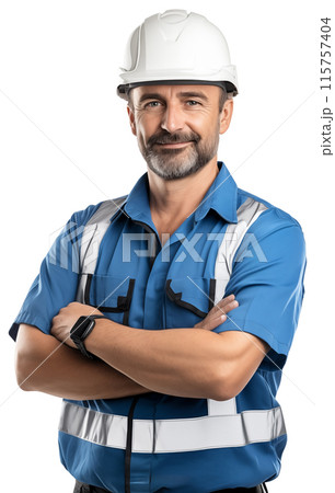 Isolated worker in white hardhat and blue uniform with crossed hands.