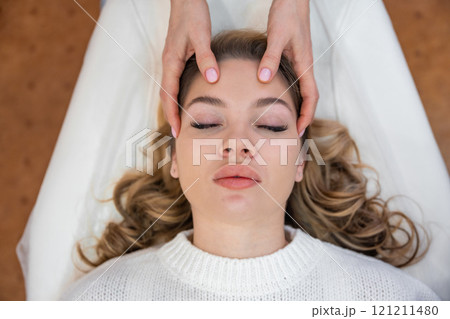 Top view of healer hands performing by lightly touched access bars therapy on young woman head, stimulating positive change thoughts and emotions. Alternative medicine concept
