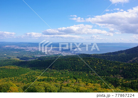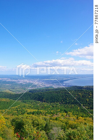 青森県むつ市 紅葉時期の釜臥山展望台 津軽海峡方面を望む