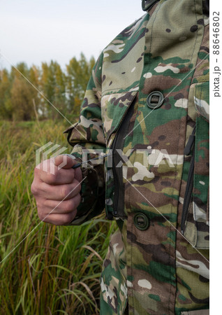 Rapper in camouflage jacket with ribbon stands on tiptoes isolat