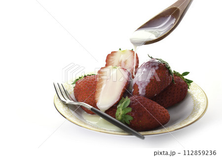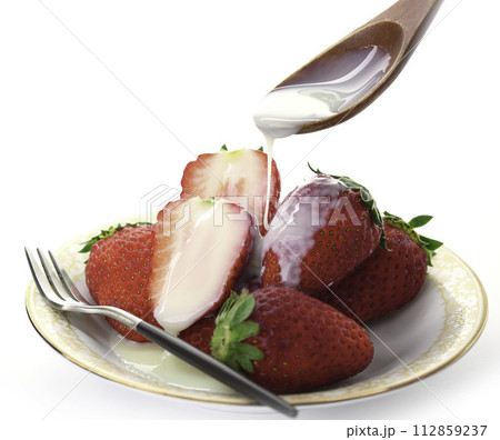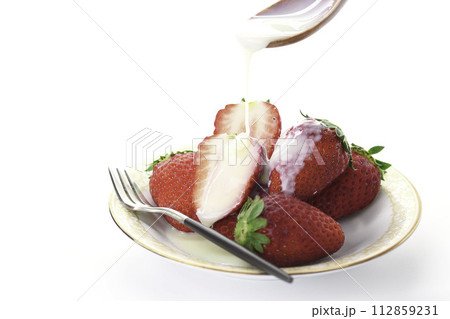 新鮮な美味しい いちご まりひめに練乳をかける