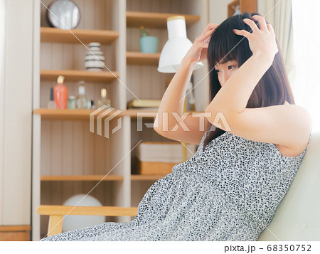 頭を抑える妊婦 頭皮の痒みや頭皮マッサージ 4:3