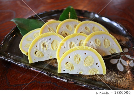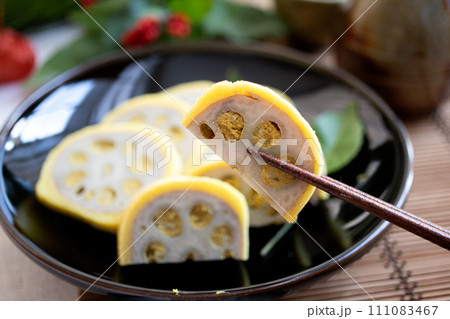 スライスした辛子蓮根 熊本県の特産物 一切れ箸でつまみ上げている