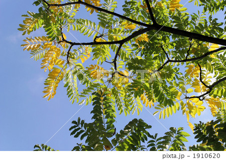 秋の青空を覆うカラスザンショウの鮮やかな黄葉
